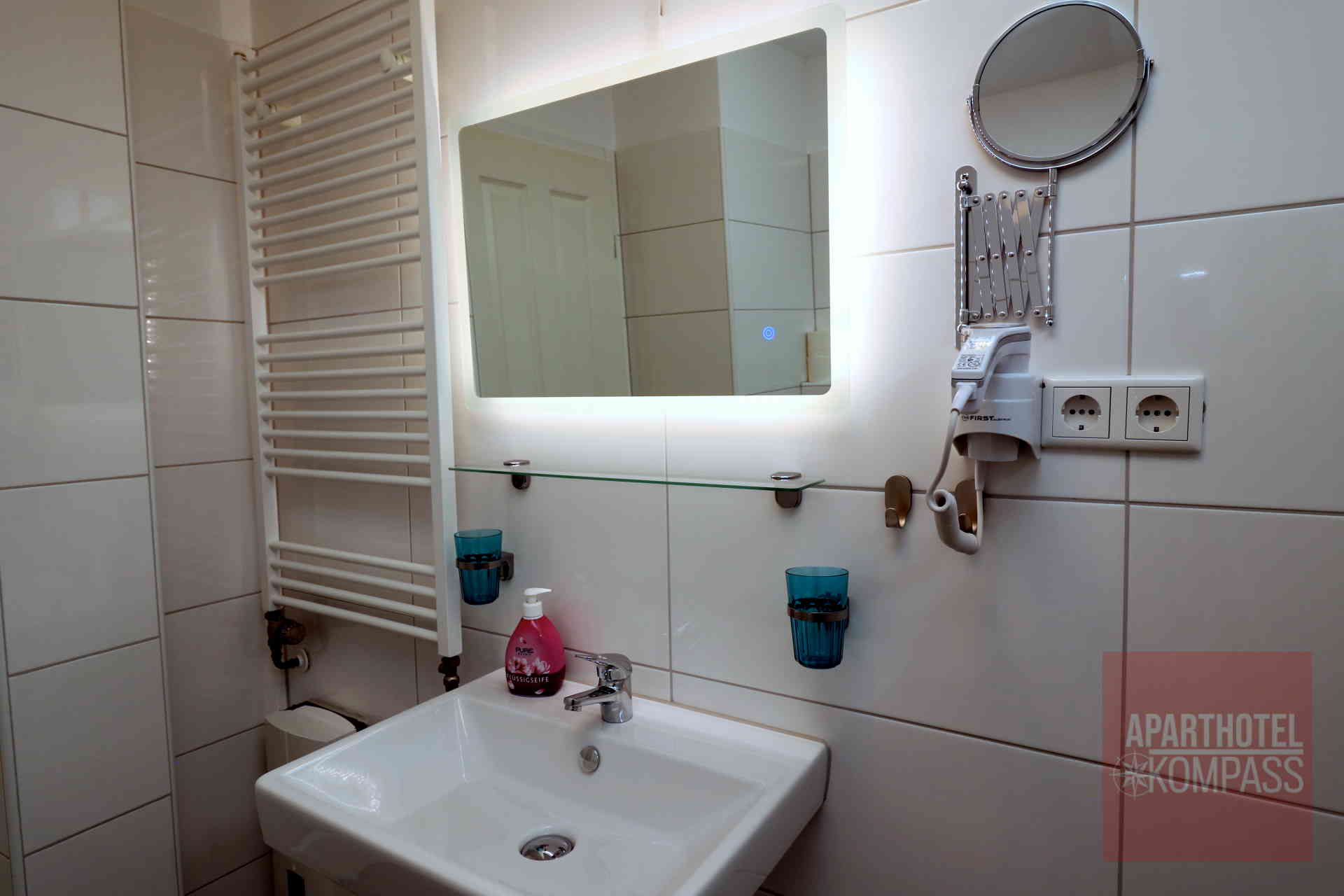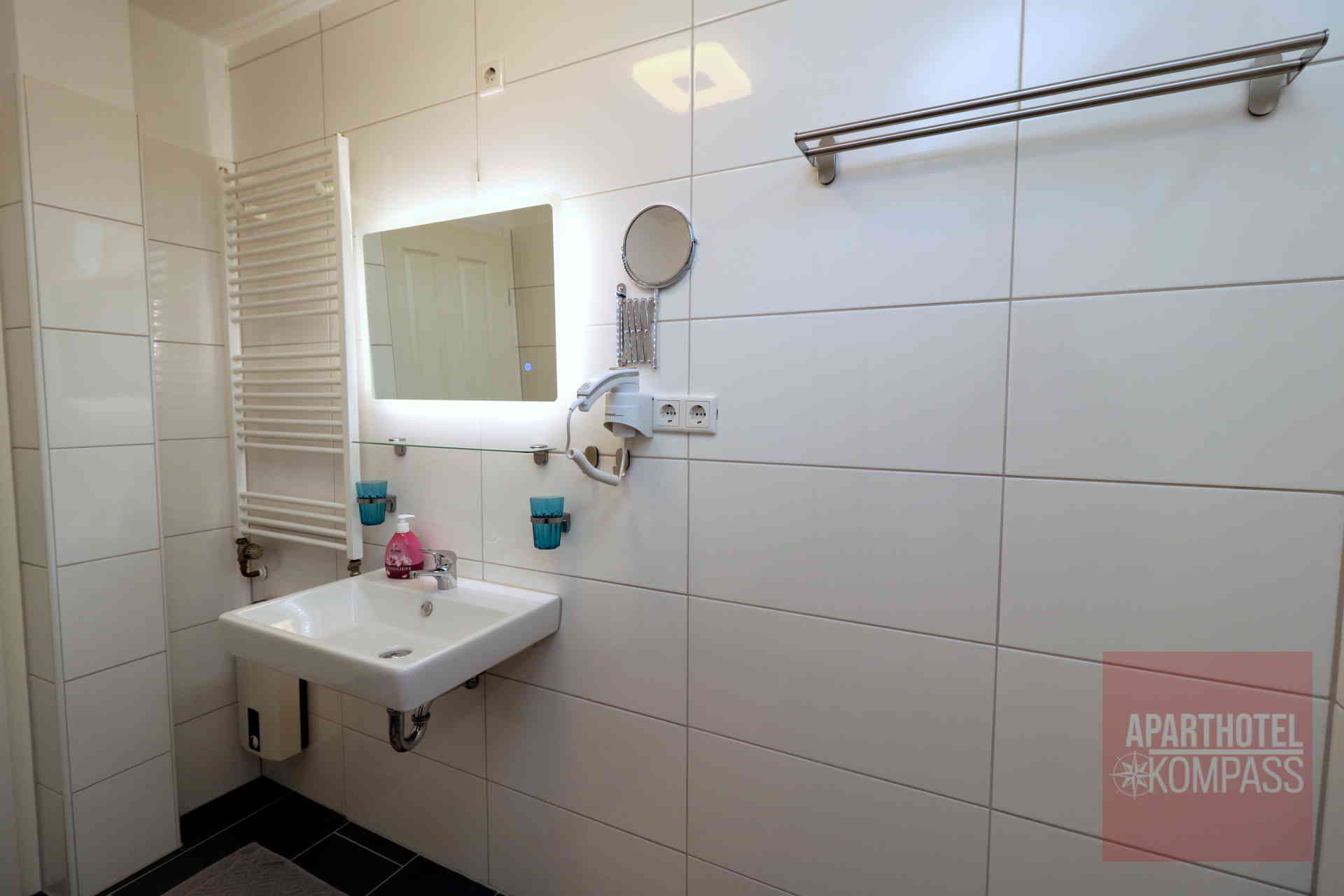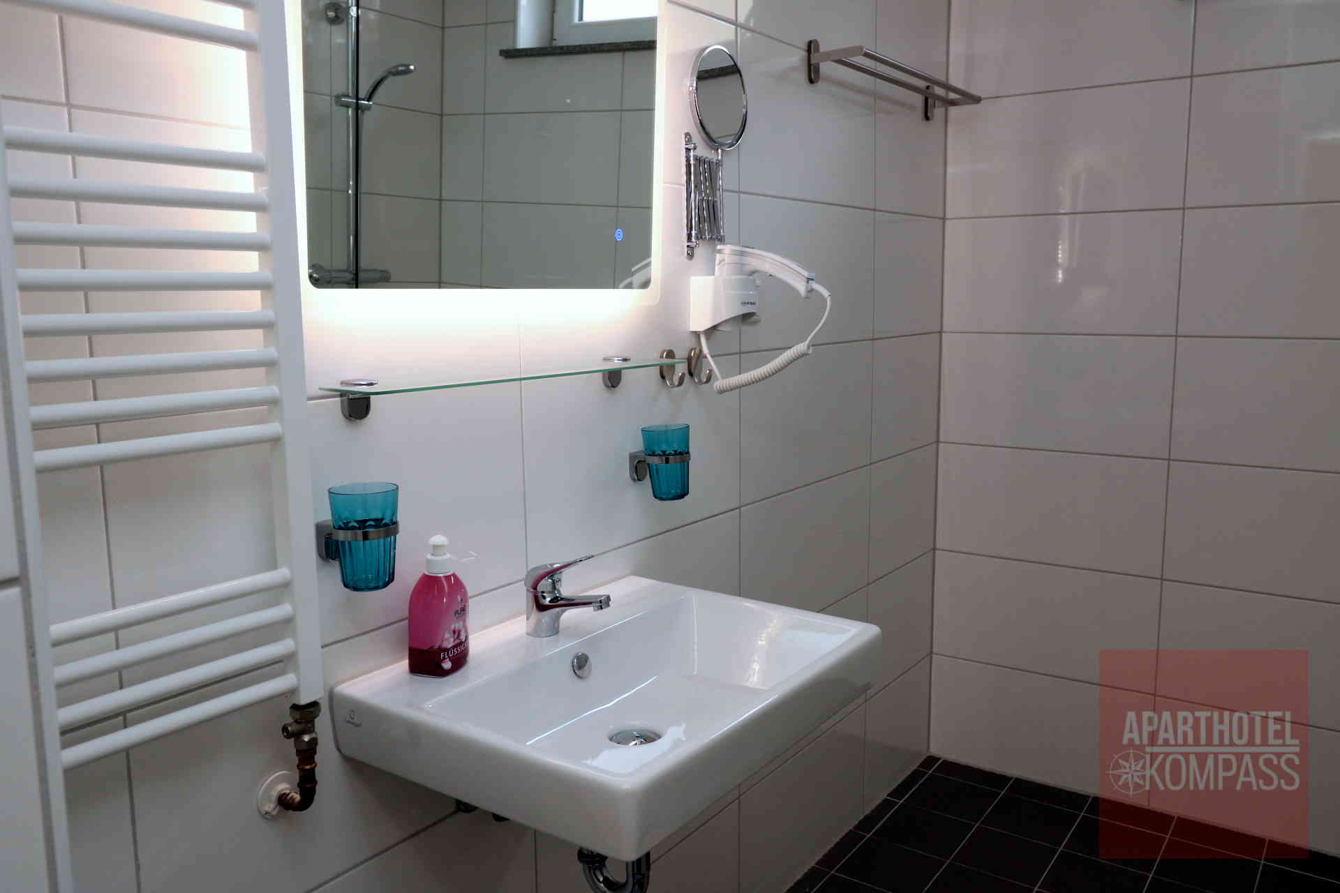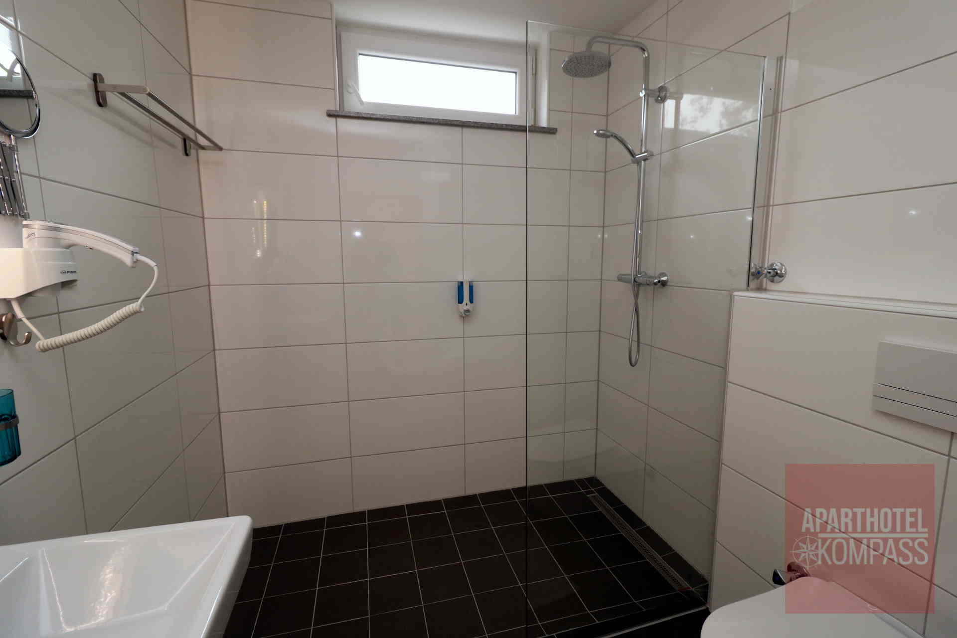 Im Duschbad gibt es eine ebenerdige Dusche, Waschtisch, Glasablage, beleuchteter Spiegel und WC. Schminkspiegel und Föhn sind ebenfalls vorhanden.