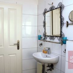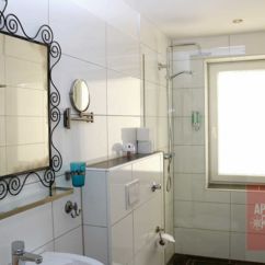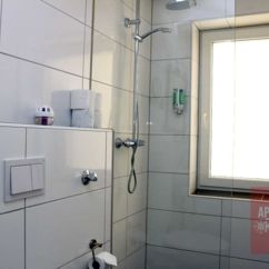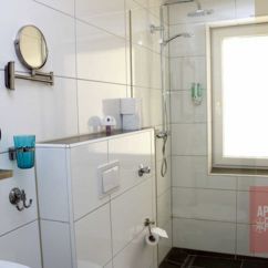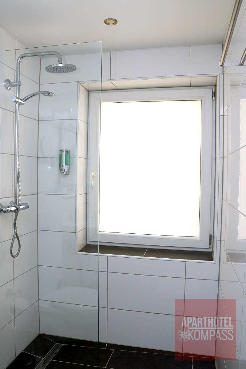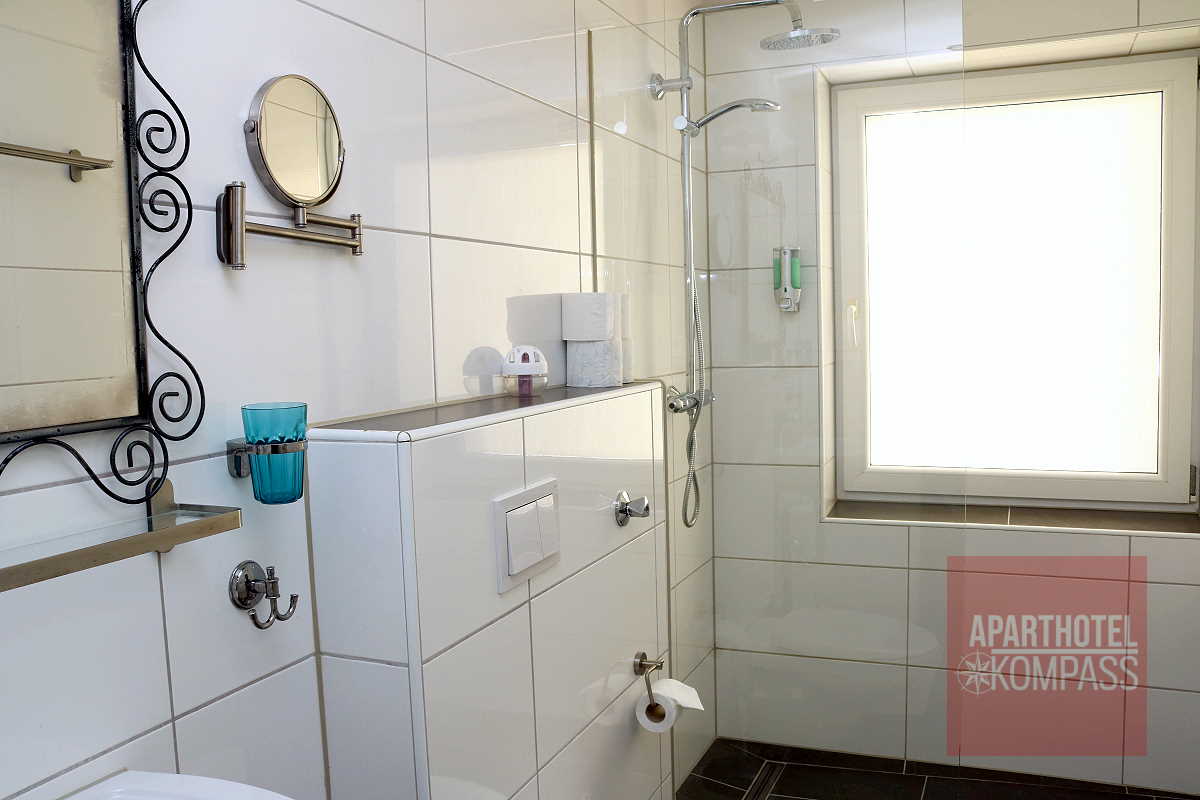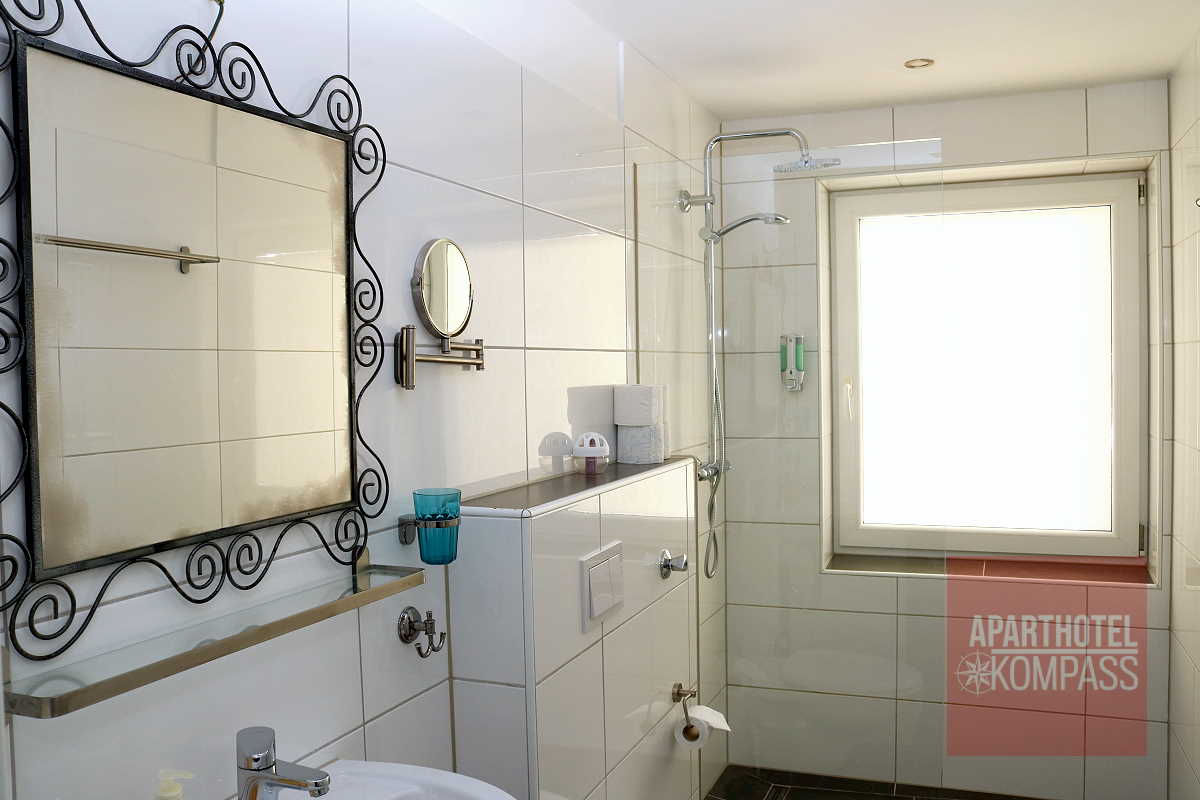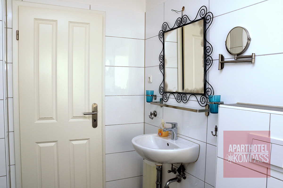 Das Badezimmer verfügt über einen Waschtisch, Spiegel, Kosmetikspiegel, WC und bodengleicher Dusche. Der Heizkörper ist als Handtuchheizung konzipiert, ein Föhn ist ebenfalls vorhanden.