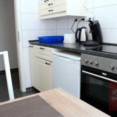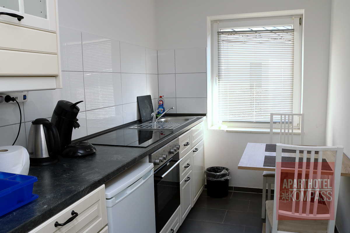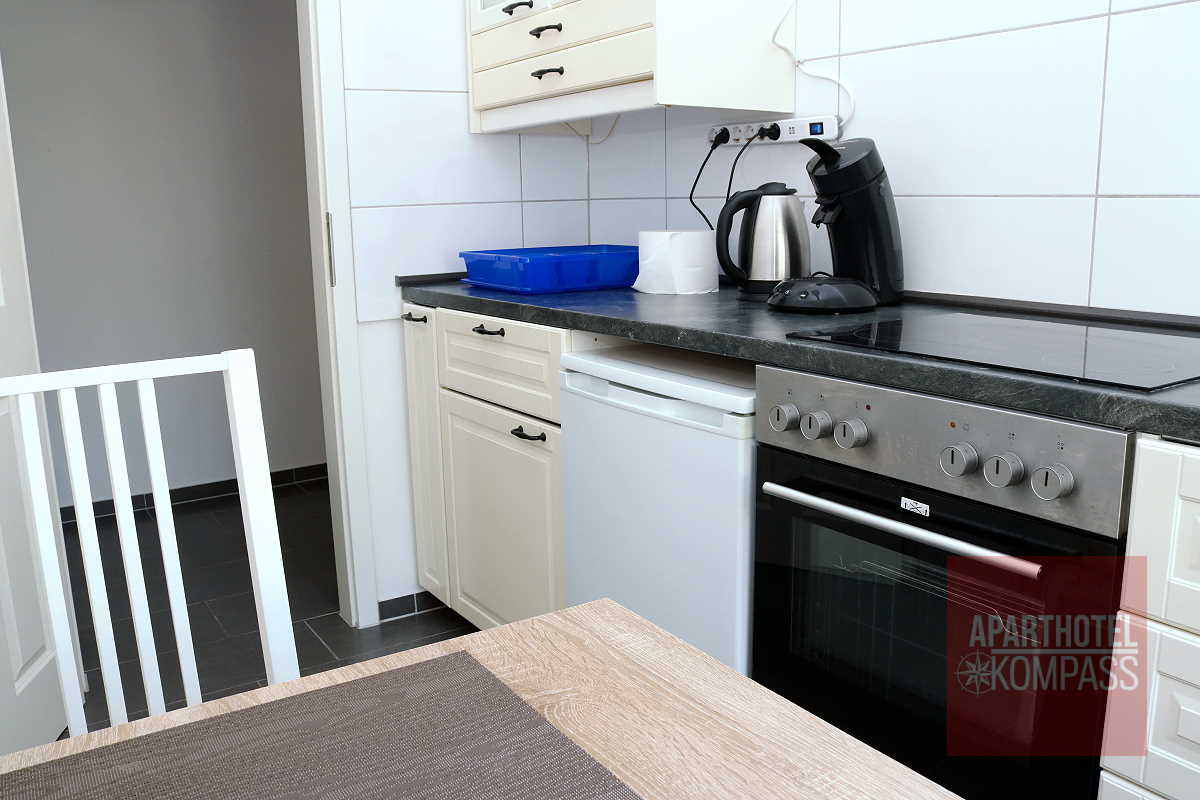 Die Küche ist mit Kühlschrank (3-Sterne-Gefrierfach), Backofen, Ceranfeld, Spülmaschine, Spüle, Kaffeemaschine, Wasserkocher, Tisch und 2 Stühlen komplett eingerichtet. Topfset, Bratpfanne, Geschirr/Besteck/ Tassen/Gläser für 4 Personen vorhanden.