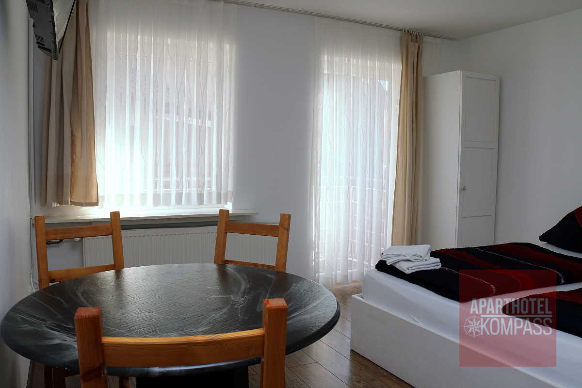 Von Schlafzimmer 1 (102) gibt es einen Zugang zu einem kleinen Balkon, der über 2 Sitzgelegenheiten und einen kleinen Tisch verfügt. Ein Aschenbecher ist ebenfalls vorhanden.