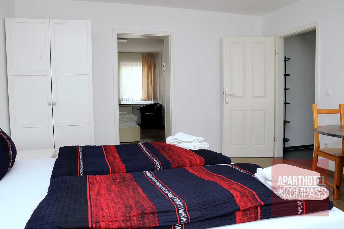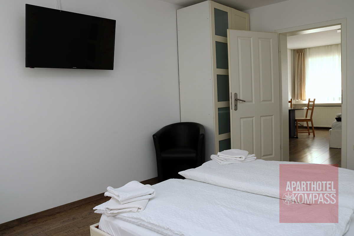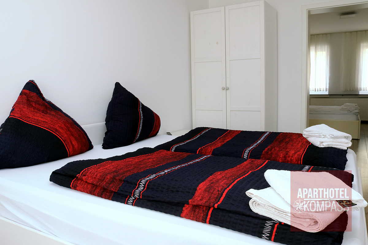Das Schlafzimmer 1 ist mit Doppelbett, einem Kleiderschrank, modernen Schrankelementen, Kabel-TV, einem kleinem Tisch und 2 Clubsesseln ausgestattet.