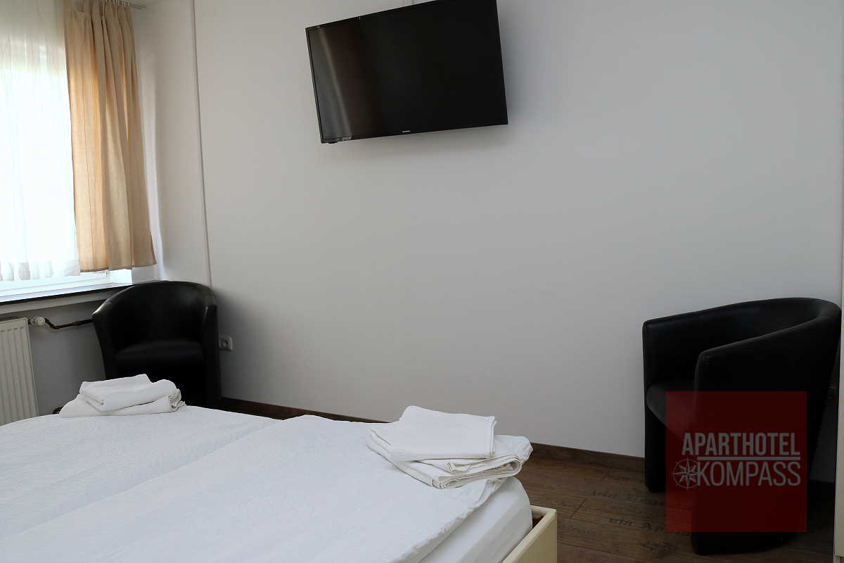 Schlafzimmer 2 verfügt über ein Doppelbett, einem Kleiderschrank, moderne Schrankelemente, Kabel-TV und 1 Clubsessel..