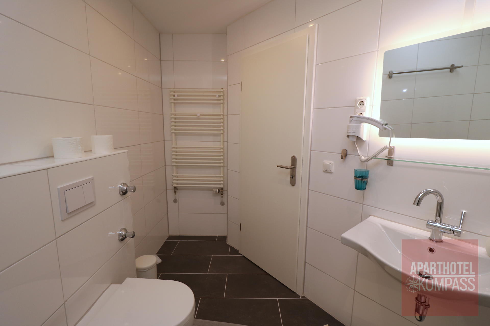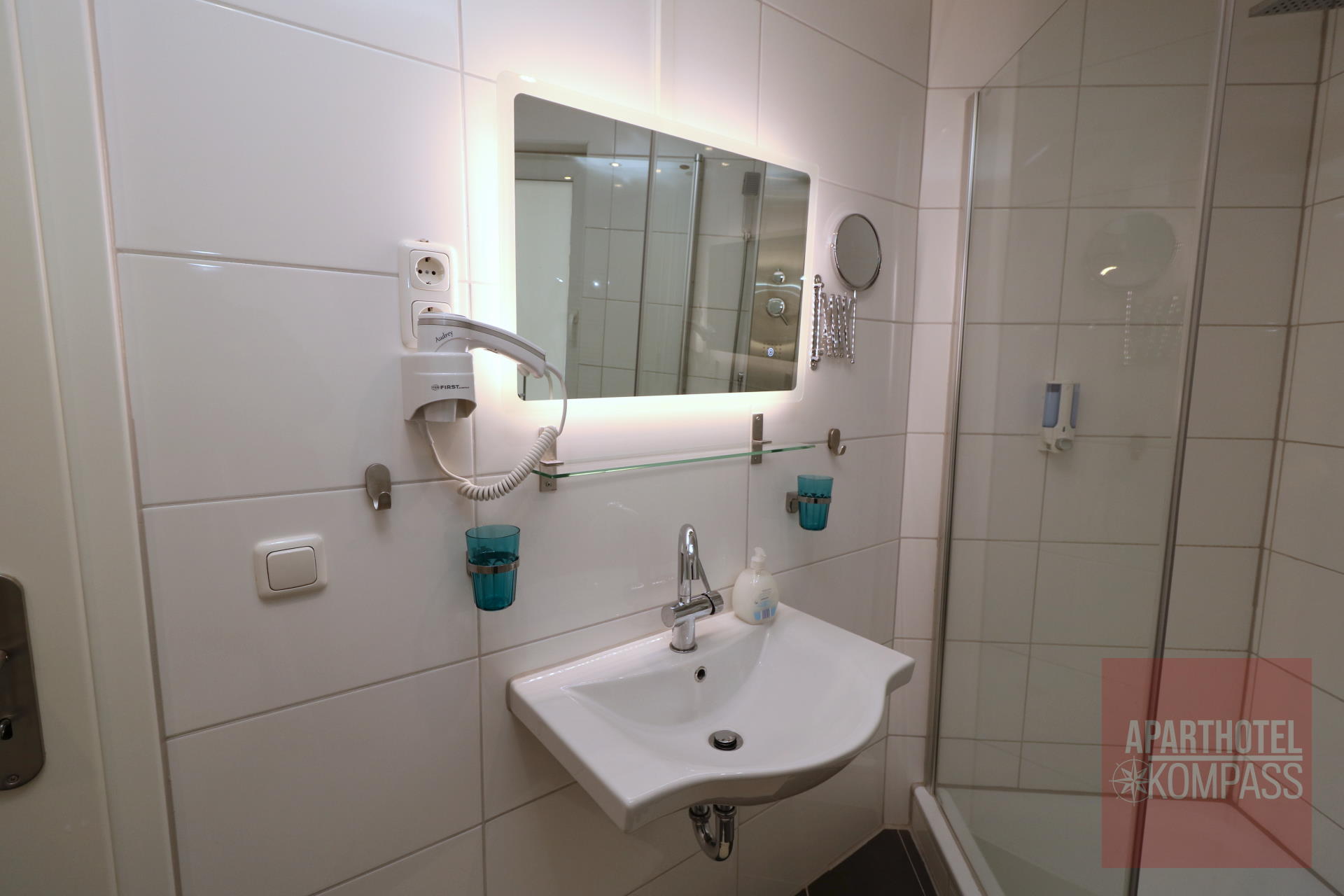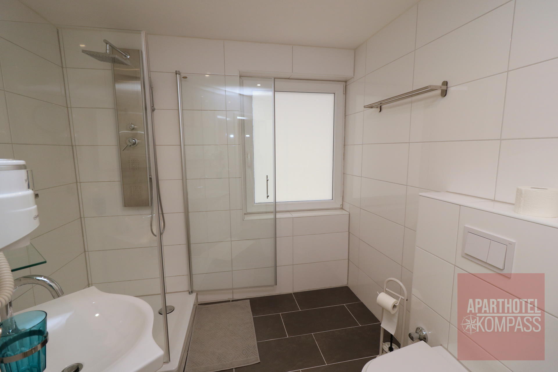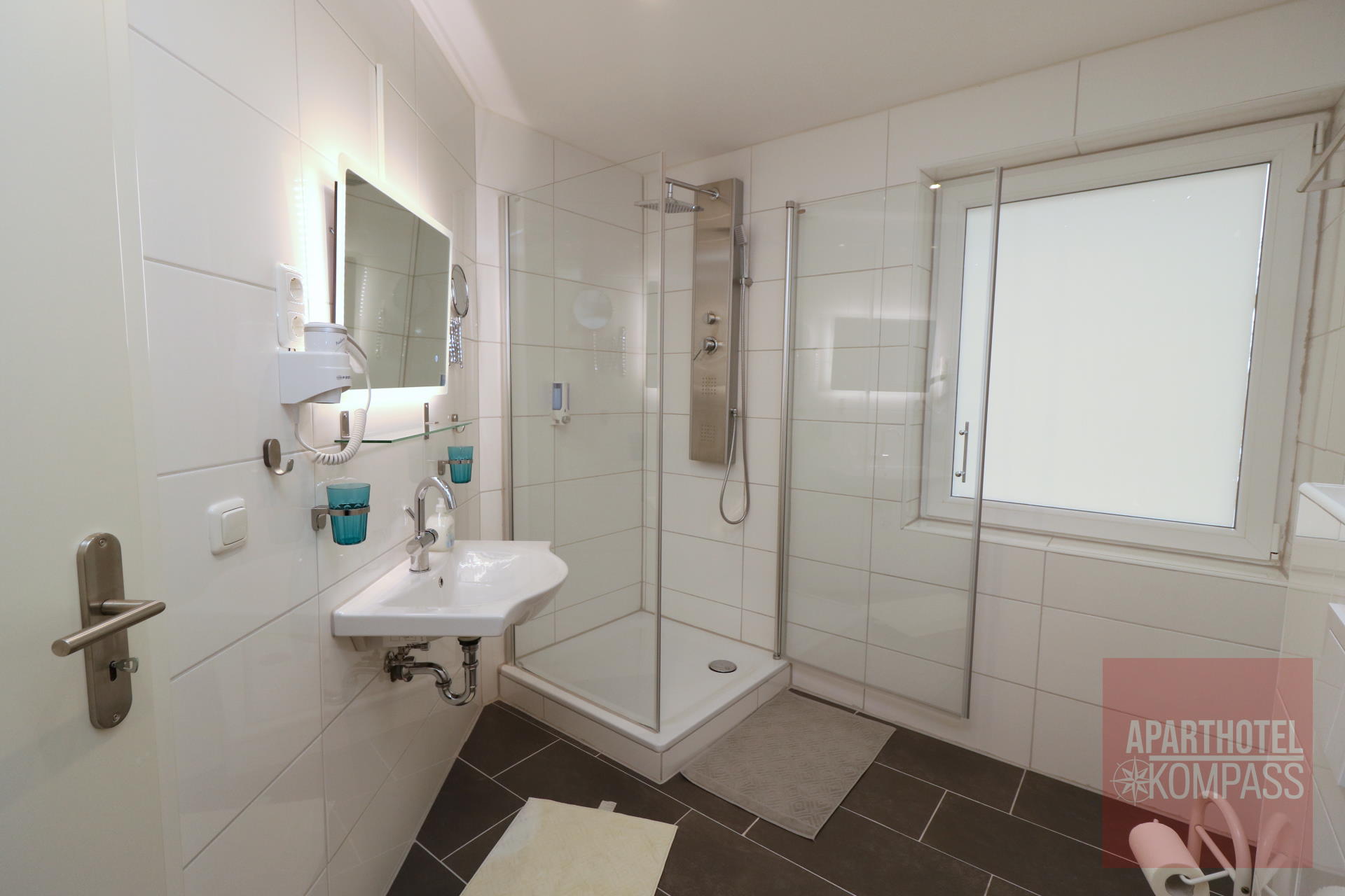 Das Duschbad verfügt über eine Duschkabine, Waschtisch, Spiegel , Glasablage und WC ausgestattet.