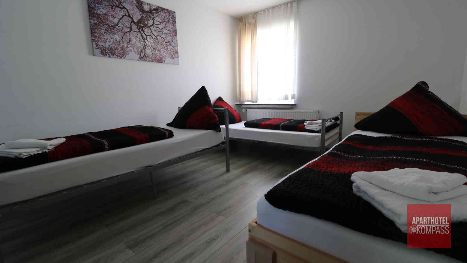 Das Schlafzimmer ist mit 3 Einzelbetten und einem dreitürigen Kleiderschrank ausgestattet.