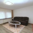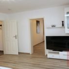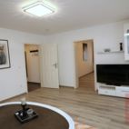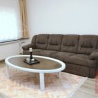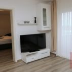 Das Wohnzimmer besitzt ein großes Sofa mit Schlaffunktion, Couchtisch, moderne Schrankelemente und Kabel-TV.