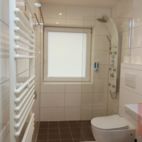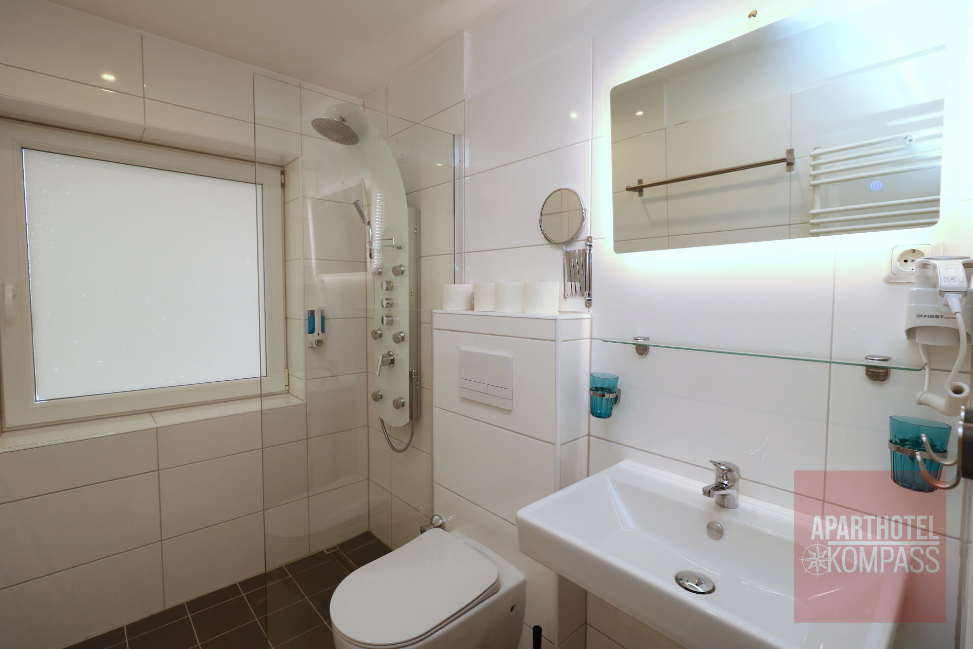 Im Duschbad befinden sich die ebenerdige Dusche, ein Waschtisch mit Glasablage und beleuchtetem Spiegel sowie das WC. Schminkspiegel und Föhn sind ebenfalls vorhanden.