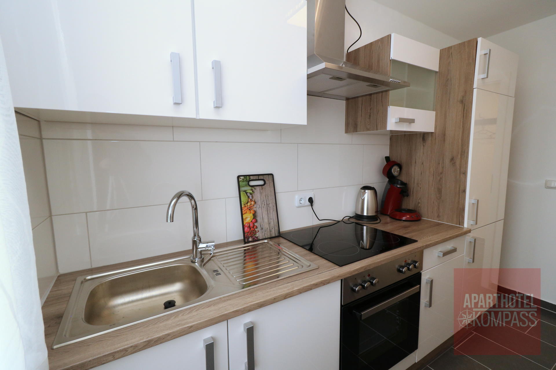 Die Küche verfügt über keine Spülmaschine. Kühlschrank mit 3-Sterne-Gefrierfach, Backofen, Ceranfeld, Dunstabzug mit Kochfeldberleuchtung, Spüle, Kaffeemaschine und Wasserkocher sowie Topfset/Pfanne, Geschirr, Besteck, Tassen und Gläser sind für 4 Personen vorhanden. Bei Buchung für 5 Personen stellen wir Ihnen weiteres Geschirr zur Verfügung.